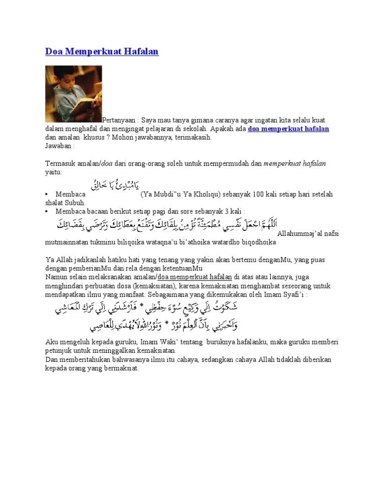 Bacalah doa ini agar mudah menghafal, tidak pelupa, cepat paham, dan ingatan lebih kuat. Karena lupa bisa menghilangkan sebagian besar pelajaran yang sudah didapat. Doa agar diberi kecerdasan oleh allah swt; Doa agar terhindar dari sifat pelupa, supaya ingatan semakin kuat. Berikut ini terdapat doa supaya tidak mudah lupa dan kuat dalam ingatan menurut ajaran islam. Simak seluruh bacaan doanya dalam bahasa arab, teks latin, dan terjemahan indonesia yang benar.